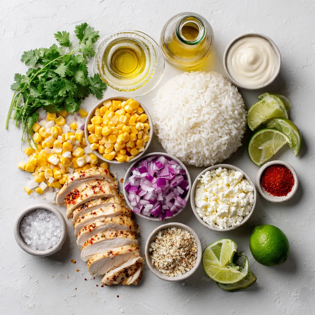 To make this Street Corn Chicken Rice Bowl, gather these fresh ingredients. Start with cooked rice as your base. You can use either white or brown rice, depending on your choice. Next, grab two boneless, skinless chicken breasts. These will be marinated to enhance the flavor.