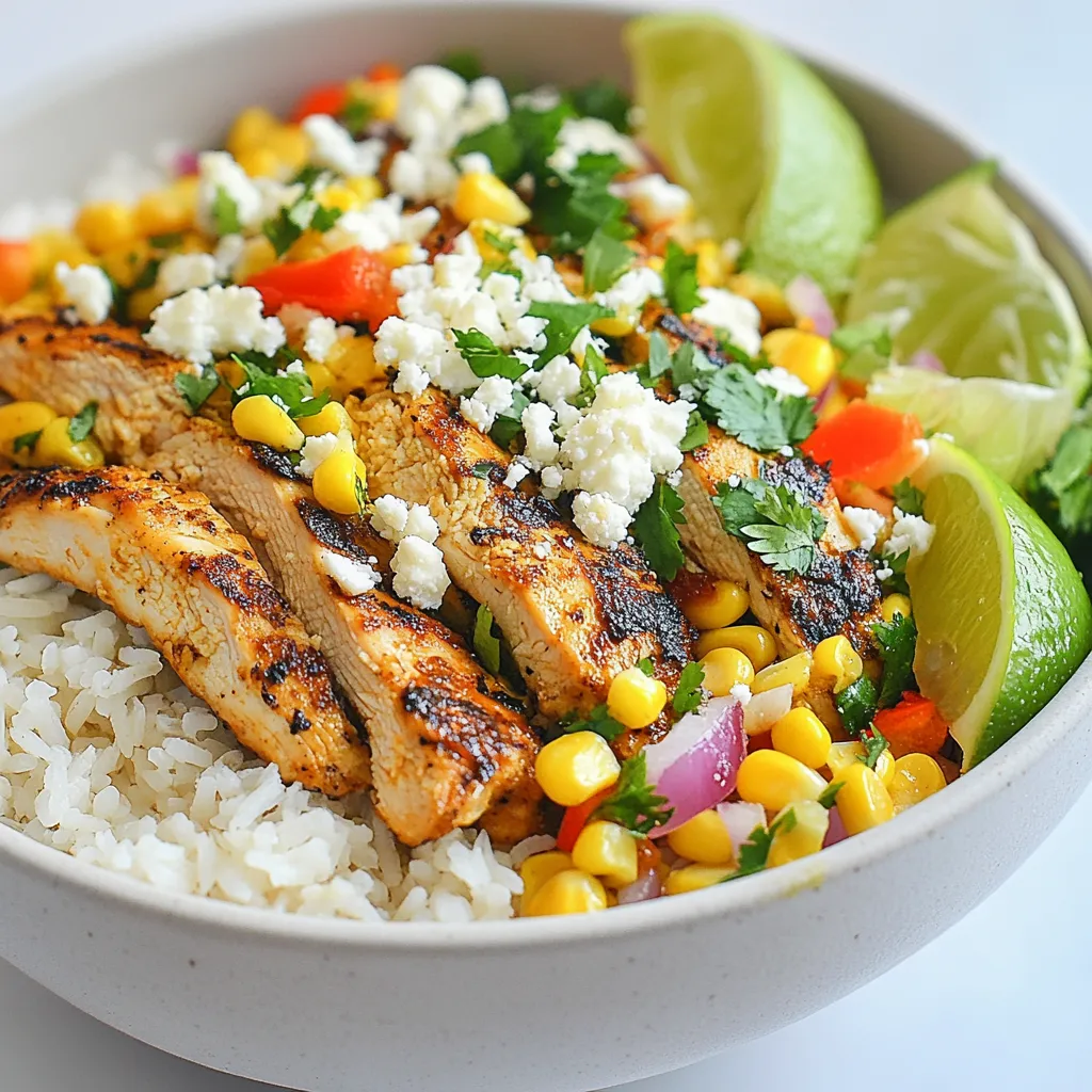 Serve it with lime wedges on the side for that extra zesty kick. Enjoy your Street Corn Chicken Rice Bowl!