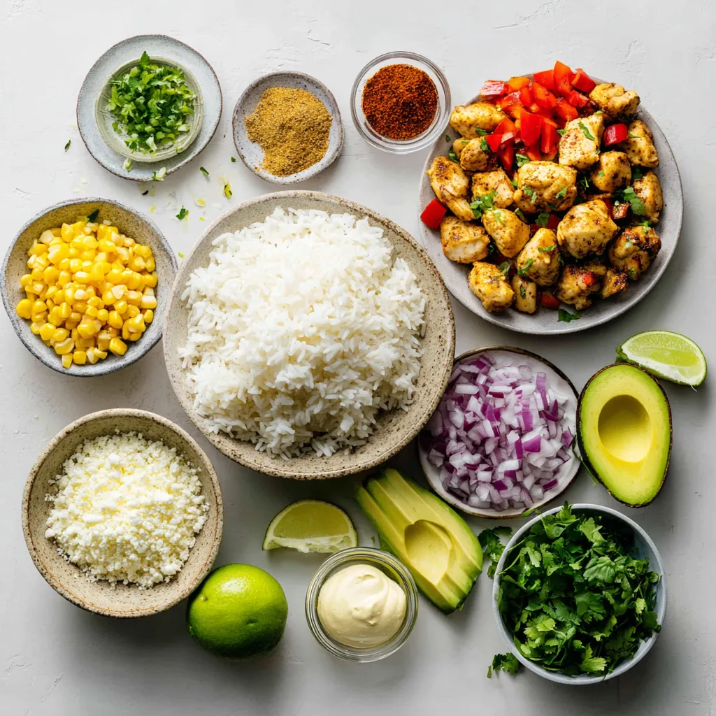 Here are the key components for the Street Corn Chicken Rice Bowl: