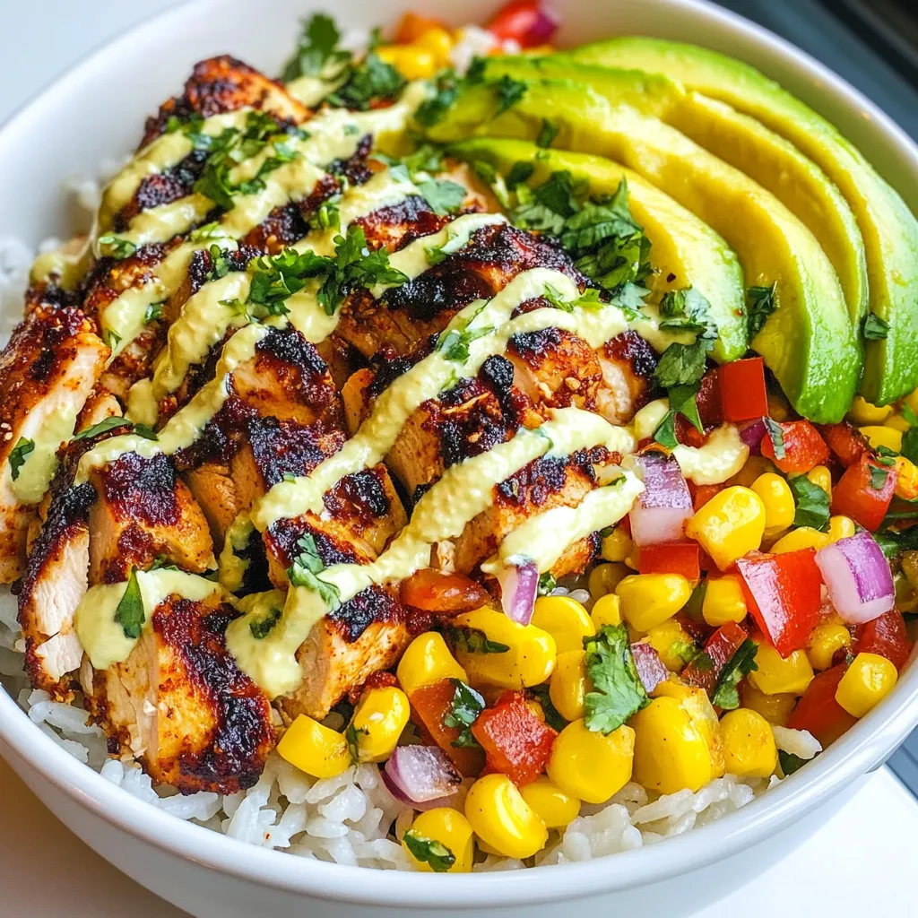 A delicious and vibrant rice bowl featuring seasoned chicken, sweet corn, and fresh toppings.
