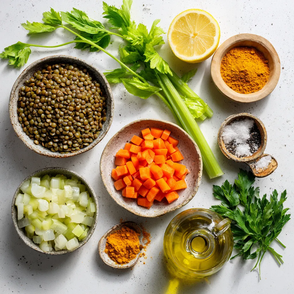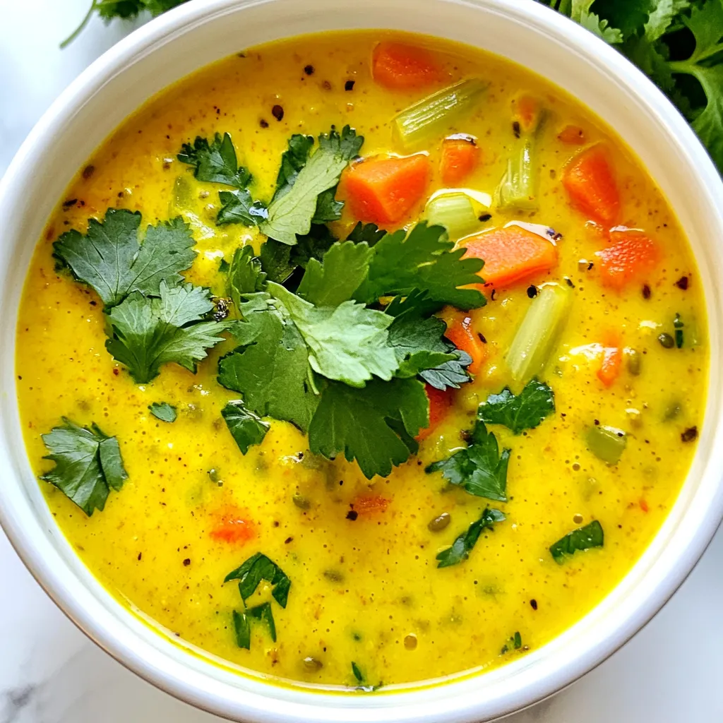 Here is a list of the ingredients you need to make Vegan Lemon Lentil Turmeric Soup: - 1 cup green or brown lentils, rinsed - 1 medium onion, diced - 2 cloves garlic, minced - 1 carrot, diced - 2 celery stalks, diced - 1 teaspoon turmeric powder - 1 teaspoon ground cumin - 6 cups vegetable broth - 1 lemon (zest and juice) - Salt and pepper to taste - 2 tablespoons olive oil - Fresh cilantro or parsley for garnish Each ingredient plays a key role in the taste and health of this soup. Lentils provide protein and fiber. They are also low in fat. Onions and garlic add flavor and help your immune system. Carrots and celery give a nice crunch and more nutrients. Turmeric and cumin bring warmth and depth to the flavor. Don't forget the lemon! It adds brightness and a fresh zing. Olive oil gives richness, while salt and pepper balance all the flavors. Finally, use fresh herbs like cilantro or parsley to top it off. They add color and a burst of freshness. With these ingredients ready, you can start making a soup that warms the soul and nourishes the body. Enjoy the process of cooking, and let the aromas fill your kitchen. {{ingredient_image_1}} - Heat 2 tablespoons of olive oil in a large pot. - Add 1 medium diced onion and 2 minced garlic cloves. - Sauté until the onion becomes translucent, about 5 minutes. This step builds the soup's foundation. The onion and garlic add rich flavors. The olive oil helps with cooking and adds healthy fats. - Stir in 1 diced carrot and 2 diced celery stalks. - Cook for an additional 4-5 minutes until slightly softened. - Sprinkle in 1 teaspoon of turmeric and 1 teaspoon of cumin. Mix everything well to coat the veggies with spices. This step adds color and warmth to the dish. Turmeric and cumin bring health benefits too. - Add 1 cup of rinsed lentils and 6 cups of vegetable broth to the pot. - Bring to a boil, then reduce the heat to simmer. Cover the pot and let it cook for about 25-30 minutes. This allows the lentils to absorb flavors and become tender. As the lentils cook, they will soften and thicken the soup. The broth helps create a warm and comforting dish. To make your soup creamy, use an immersion blender. Blend only half of the soup for a nice mix of smooth and chunky. This gives your soup a rich feel. If you don't have a blender, you can mash some lentils with a fork. For flavor, always taste as you go. Add salt and pepper slowly. A little at a time helps avoid over-seasoning. You can also squeeze in extra lemon juice for brightness. This adds a fresh lift. Cooking lentils well is key. Rinse them before cooking to remove dirt. Cook them in the broth, not water. This helps them soak up all the flavor. Check them after 25 minutes. They should be soft but not mushy. When it comes to veggies, chop them evenly. This helps them cook at the same time. Sauté them until they are just soft. This keeps their color bright and taste fresh. Enjoy the vibrant look of your soup as much as its taste! Pro Tips Soaking Lentils: Soaking your lentils for a few hours can reduce cooking time and enhance their digestibility. Adjusting Consistency: If you prefer a thinner soup, simply add more vegetable broth or water to reach your desired consistency. Flavor Boost: For an extra flavor boost, consider adding a bay leaf or a sprig of thyme while simmering the soup. Storage Tips: This soup stores well in the refrigerator for up to 5 days and can also be frozen for longer storage. Just reheat before serving! {{image_2}} You can switch up the lentils in this soup. Black beans or chickpeas work well. Quinoa or barley can also add a nice texture. For herbs, try using dill or basil instead of cilantro or parsley. Each herb brings its unique flavor. Want some heat? Add a pinch of cayenne or chili powder. This spice brings warmth without hiding the soup's zest. Pair this soup with crusty bread or a fresh salad. These sides complement the soup and add crunch. Enjoy your meal with a squeeze of extra lemon for brightness. To keep your Vegan Lemon Lentil Turmeric Soup fresh, store it in an airtight container. Make sure the soup cools down before sealing it. This helps stop bacterial growth. It lasts in the fridge for about 4 to 5 days. If you want to enjoy it later, freezing is a great option. To freeze leftovers, let the soup cool first. Then, pour it into freezer-safe bags or containers. Leave some space at the top for expansion. This keeps the soup from bursting. When you want to eat it, take it out of the freezer and place it in the fridge overnight to thaw. For reheating, warm it on the stove over low heat. Stir often to avoid sticking. You can also microwave it in a bowl. Just cover it to keep moisture in. Enjoy your soup with fresh flavor! Yes, you can use other lentils. Red lentils cook faster and become soft. Green or brown lentils hold their shape better. Each type adds a different texture to the soup. Experiment with your favorite lentils for varied flavor! Absolutely! This soup stores well in the fridge. It can last up to five days. Just let it cool before storing it in an airtight container. You can also freeze it for up to three months. Simply thaw and reheat when you're ready to enjoy! To spice it up, add some red pepper flakes. You can also add a chopped jalapeño for heat. For more flavor, try adding smoked paprika or a splash of hot sauce. Fresh herbs like thyme or basil can enhance the taste, too. Experiment to find your perfect blend! Yes, you can blend part of the soup for creaminess. Use an immersion blender or a regular blender. Blend until you reach your desired texture. This adds a rich and smooth feel to the soup without using dairy. This soup pairs well with crusty bread or a fresh salad. A side of quinoa or brown rice also complements it. You can even serve it with a dollop of vegan yogurt for added creaminess! Store leftovers in an airtight container. Keep it in the fridge for up to five days. For longer storage, freeze it in portions. This way, you can enjo