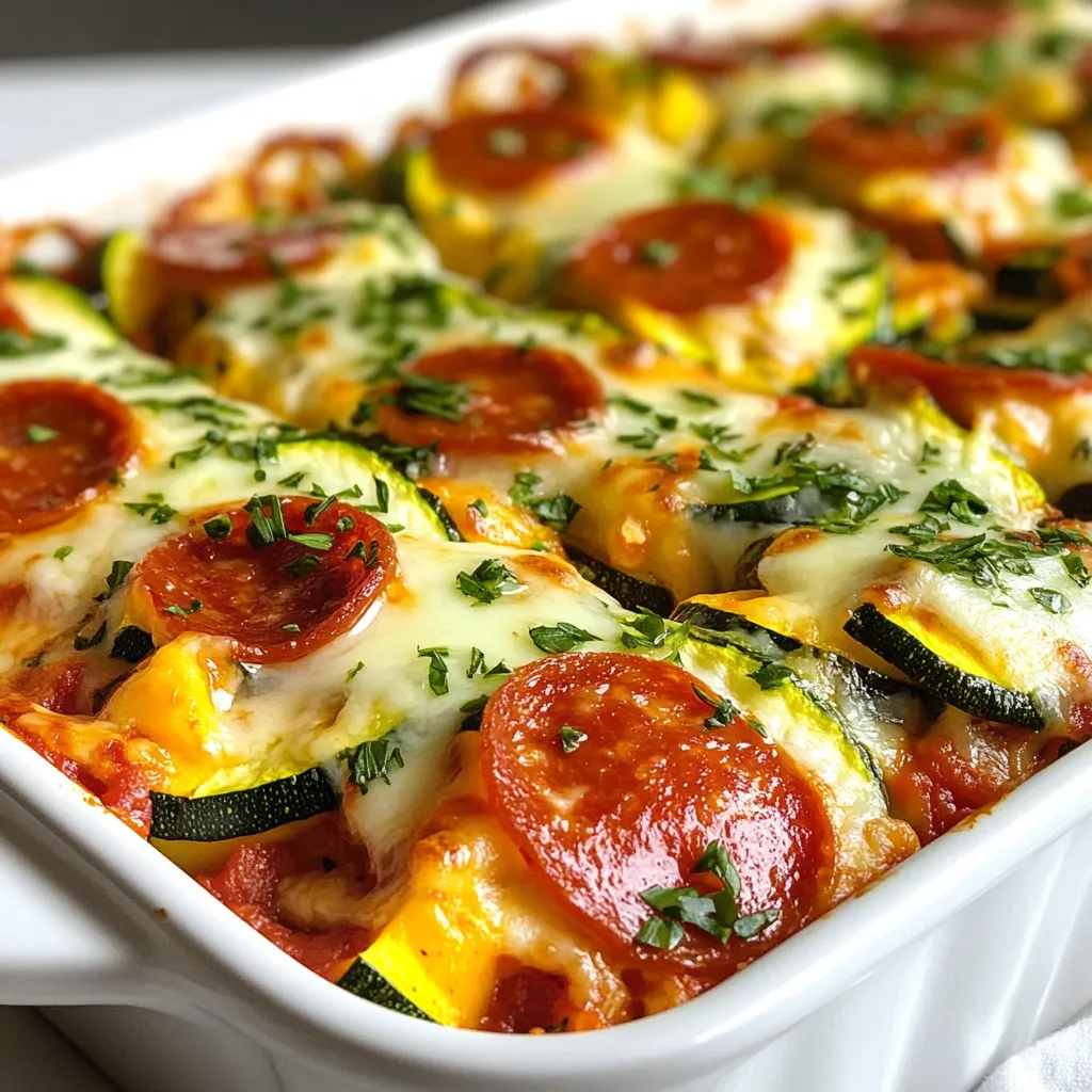 A delicious and healthy twist on pizza, featuring layers of zucchini, marinara sauce, cheese, and pepperoni.