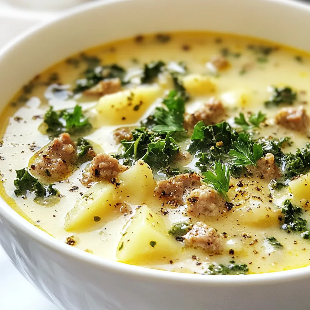 - 1 lb Italian sausage, casings removed - 1 medium onion, diced - 3 cloves garlic, minced - 4 cups kale, chopped - 4 medium potatoes, diced - 6 cups chicken broth - 1 cup heavy cream - 1 teaspoon red pepper flakes (adjust to taste) - Salt and pepper to taste - 2 tablespoons olive oil - Fresh parsley, chopped (for garnish) When you make Zuppa Toscana, use these fresh ingredients. The Italian sausage gives the soup its rich flavor. I like to use a good quality sausage for the best taste. Next, diced onion and minced garlic add depth and aroma. You’ll want some kale for a pop of green. The kale wilts perfectly into the broth. Diced potatoes add heartiness and texture. I prefer using Yukon Gold potatoes for their creaminess. Chicken broth is key for a savory base. Heavy cream gives the soup a nice, creamy finish. You can adjust the amount of red pepper flakes for your spice level. Finally, season with salt and pepper to taste. Don’t forget fresh parsley for a lovely garnish. This mix of ingredients makes Zuppa Toscana a warm and hearty meal. {{ingredient_image_1}} Start your Zuppa Toscana by heating 2 tablespoons of olive oil in a large pot over medium heat. Once the oil is hot, add 1 medium diced onion. Sauté it until it turns soft and clear, about 3 to 4 minutes. Next, add 3 minced garlic cloves to the pot. Stir it all together for a minute. Now, it is time to add the 1 pound of Italian sausage. Cook the sausage until it is well-browned. Break it up into small pieces as it cooks to ensure even flavor. Once the sausage is browned, toss in 4 diced medium potatoes and 6 cups of chicken broth. Stir the mixture well and bring it to a boil. After it boils, lower the heat and let it simmer. Cook until the potatoes are soft, which takes about 15 to 20 minutes. This step fills your kitchen with a warm, hearty aroma. Now, it’s time to make your soup shine! Add 4 cups of chopped kale and 1 teaspoon of red pepper flakes. Stir the mix and let it cook for 5 more minutes. This will wilt the kale and add a nice kick. Finally, pour in 1 cup of heavy cream. Stir everything together and let it heat for another 5 minutes. Don’t forget to taste and add salt and pepper as needed. Serve your Zuppa Toscana hot, garnished with fresh chopped parsley for a pop of color. Enjoy the delicious warmth of this Italian comfort soup! Choosing the right Italian sausage is key. I prefer using spicy sausage for a kick. Sweet sausage works if you want milder soup. Mix both for a balanced taste. The flavor of the sausage shapes the whole dish. Adjusting spice levels with red pepper flakes is easy. Start with one teaspoon, then taste. Add more if you like heat. Remember, you can always add more spice, but you can't take it out. Ensuring the right texture for potatoes and kale is crucial. Cut potatoes into small pieces so they cook evenly. Aim for fork-tender potatoes, not mushy. For the kale, add it near the end. This keeps it bright and vibrant. Tips for reheating for best results include using the stovetop. Heat slowly to prevent burning. Add a splash of cream or broth if it thickens too much. This keeps the soup creamy and smooth. Pro Tips Use Fresh Ingredients: Fresh kale and high-quality Italian sausage will elevate the flavor of your Zuppa Toscana significantly. Adjust the Spice: Feel free to modify the amount of red pepper flakes according to your heat preference for a customized kick. Thicken the Soup: For a thicker consistency, mash some of the potatoes against the side of the pot before adding the cream. Garnish with Care: A sprinkle of fresh parsley not only adds color but also enhances the freshness of the dish. {{image_2}} You can change up the greens in Zuppa Toscana. Instead of kale, try spinach or Swiss chard. These greens add their own unique taste. You can also mix in some broccoli or green beans for extra crunch. For sausage, use turkey or chicken sausage if you want a lighter dish. You can even try spicy sausage for a kick. If you want a meatless option, use mushrooms for a hearty texture. To make Zuppa Toscana gluten-free, choose a gluten-free broth. Most broths are naturally gluten-free, but always check the label. You can also use gluten-free pasta instead of potatoes for a twist. For a dairy-free version, swap heavy cream with coconut cream or cashew cream. Both options offer a creamy base without dairy. If you want a vegan variant, skip the sausage and cream. Use vegetable broth and add more veggies for flavor. Try lentils or beans for protein. To keep your Zuppa Toscana fresh, store it in a sealed container. Let it cool down first. Place it in the fridge for up to three days. If you want to keep it longer, freeze it. Pour the soup into freezer-safe bags or containers. Lay the bags flat for easy stacking. Zuppa Toscana can last up to three months in the freezer. Just remember to label your containers with the date. When you're ready to enjoy leftovers, you can reheat it on the stovetop or in the microwave. For the stovetop, pour the soup into a pot. Heat it over medium heat, stirring often. This keeps the soup from sticking and helps it heat evenly. It should take about 10 minutes to warm through. If you prefer the microwave, use a microwave-safe bowl. Cover it with a microwave-safe lid or wrap. Heat it in intervals of one minute, stirring in between. This helps it warm evenly. Make sure it's hot all the way through before eating. Aim for a temperature of at least 165°F to ensure food safety. Enjoy your comforting soup again! Zuppa Toscana is a hearty Italian soup. It comes from the Tuscany region. This dish combines Italian sausage, potatoes, kale, and cream. The mix of flavors warms you up on cold days. It has a rich taste, thanks to the sausage and cream. You can find this soup in many Italian restaurants. To lower calories in Zuppa Toscana, consider these tips: - Use ground turkey instead of Italian sausage. - Replace heavy cream with a lighter option, like half-and-half or almond milk. - Ad