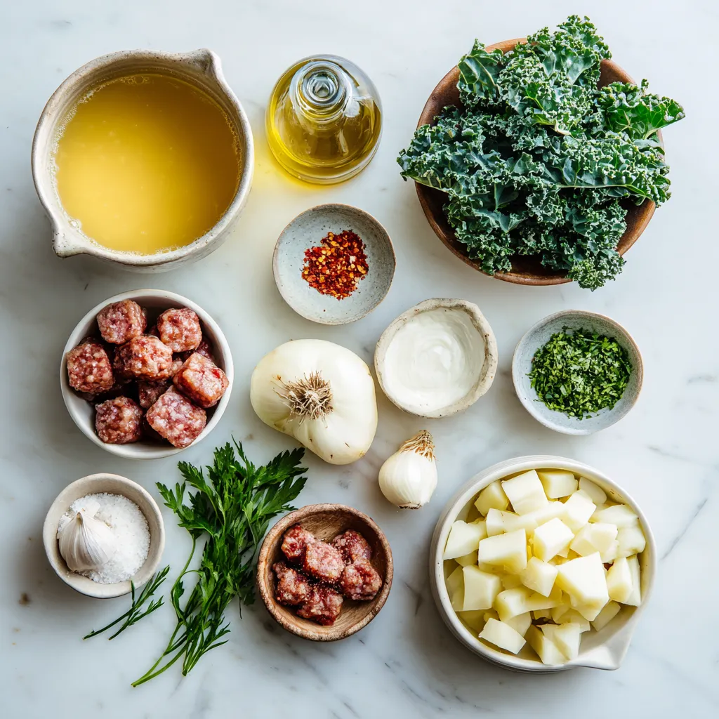 A hearty Italian soup featuring sausage, potatoes, and kale in a creamy broth.